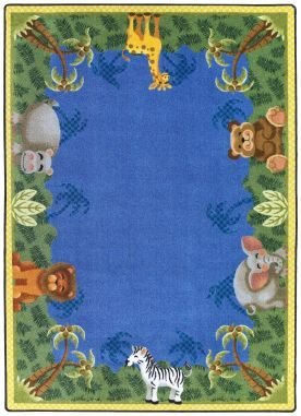Checkerboard palm trees swaying above the heads of familiar jungle friends will make children laugh with delight.Feature