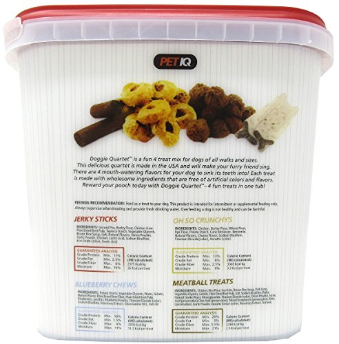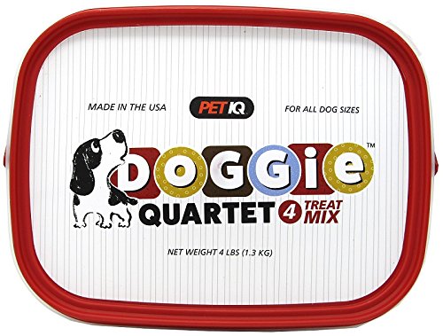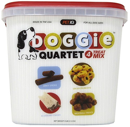 -. Binding : Misc. -. Brand : PetIQ -. EAN : 0818145017087 -. Feature : 4 Different Treats in a Resealable Tub / Made in the USA / Each Different Treat is Bagged Separately in the Tub / For All Dog Sizes -. Label : PetIQ -. LegalDisclaimer : exp 1/2018 -. Manufacturer : PetIQ -. PackageQuantity : 1 -. ProductGroup : Pet Products -. ProductTypeName : PET_SUPPLIES -. Publisher : PetIQ -. Studio : PetIQ -. Title : PetIQ Doggie Quartet Dog Treats Mix, Variety Pack, 4LB -. UPC : 818145017087