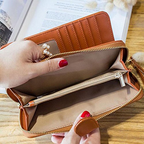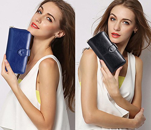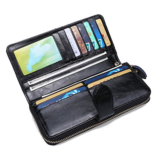 -. Feature : Bright oil wax cowhide leather, feels luxury, comfortable and good looking / Snap closure and zipper, protect your cash, credit card and ID card safe / With a string, convenient to carry. Features a unique military grade shielding technology and proP.R.Ietary blocking material / Roomy enough for placing cards, photos, cash, coin, mobile phone (fit for iphone 7 plus, etc) / 10 credit card slots, 1 zip closure, 2 main compartment, 2 photo holder