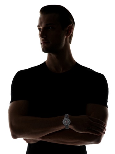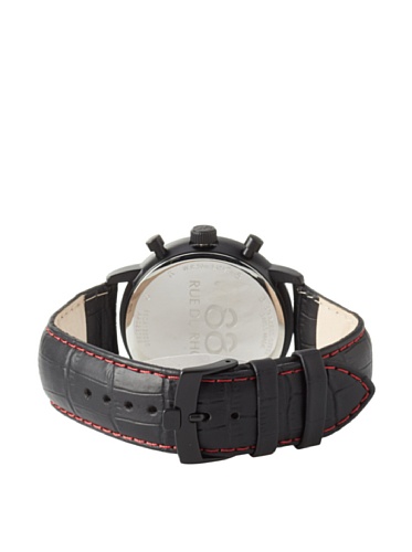Black ion-plated stainless steel case with a black leather strap. Fixed black ion-plated bezel. Black dial with silver-tone hands and index hour markers. Tachymeter around the outer rim. The Double 8 logo marks the 12 o'clock position. Dial Type: Analog. Luminescent hands. Date display at the 4 o'clock position. Chronograph - three sub-dials displaying: 60 second, 30 minute and 12 hour. Quartz movement. Scratch resistant mineral crystal. Solid case back. Case diameter: 42 mm. Case thickness: 10 mm. Round case shape. Band width: 19 mm. Tang clasp. Water resistant at 50 meters / 165 feet. Functions: chronograph, date, hour, minute, second. Casual watch style. Rue du Rhone Double 8 Chronograph Black Dial Black Leather Mens Watch 87WA120046.Feature