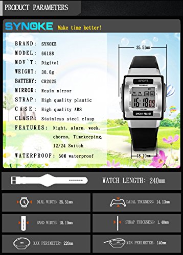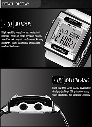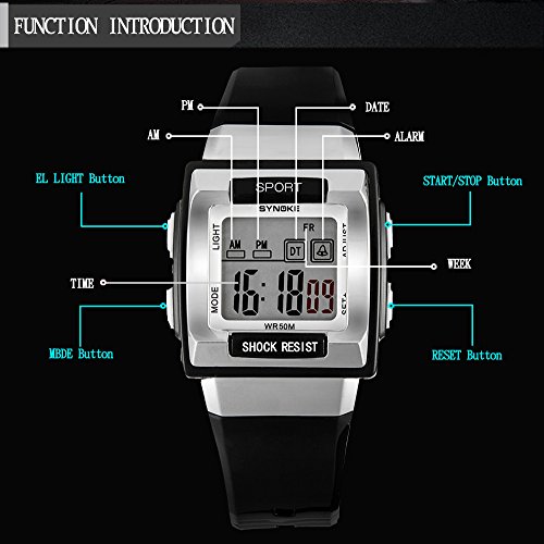 -. Feature : Multi-Functional: 12/24-hour format, dual time display, EL backlight, Calendar(date, week and month), chronograph and more / Comfortable silicone rubber watch band will lead you to the edge of sport fashion. Perfect for both indoor and outdoor activities / Water resistant to 30m (98ft):withstands rain and splashes of water, but no showering / Package including: 1*watch, 1*user manual, 1*gift
