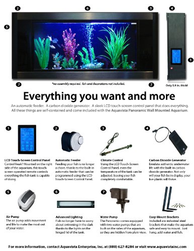 - Feature : Low Maintenance -designed to simplify your life, the Aquavista Panoramic Wall Aquarium requires less than 15 minutes per month / No Daily Care -complete with embedded Automatic Feeder, caring for your fish has never been easier; Just refill the feeder periodically and enjoy / Easy Set Up with Space Saving Design -no assembly required; Custom mounting brackets makes hanging safe and easy / Self-contained Advanced Aquarium System / Create an Underwater Garden -each unit comes with a Carbon Dioxide Generator that allows live plants to photosynthesize and prosper