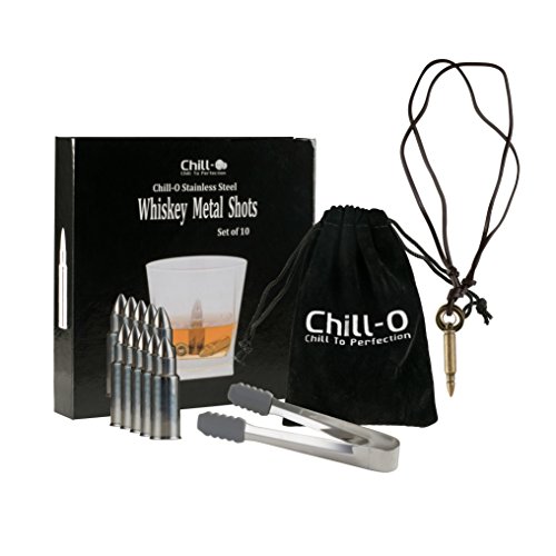 Studio : Chill-O Publisher : Chill-O Product Description Every pack of Chill-O Stainless Steel Whiskey Metal Shots Set brings you 10 amazing metal shots. The metal shots replace cold water or ice as chilling agents for your alcoholic drinks. Unlike the other chilling options, these metal shots do not dilute your drinks, nor do they affect your drink's flavor in any way. You can enjoy your drinks just like they taste, not diluted, just chilled to your preference. All metal shots are made of high quality FDA approved stainless steel, which is completely safe for use with food and drinks. As functional as they are, the metal shots also have a high aesthetic potential. The shiny chillers are instant attention seekers at the parties, which make them excellent conversation starters. Rest assured, you are bound to get some compliments from your guests on your choice of chillers. In addition to all of this, you get a complimentary necklace that features a leather strap and a metal-shot pendant. How cool is that! Hurry, get your pack of Chill-O metal shots right away. You and your guests will love them. Directions to Use: Place the metal shots in the freezer for at least 4 hours before use. Add 3-4 of these shots per drink, and serve your guests instantly chilled drinks. Once they are used, simply rinse them with water to reuse them. Dimensions: Metal Shots: 45mm Contents of the Pack: This pack contains 10 Stainless Steel metal shots, a pair of tongs, a necklace with leather strap and a metal shot pendant, and a beautiful pouch, all neatly packed in a gift box. 0