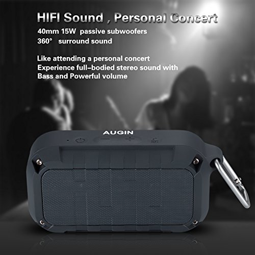 -. Binding : Electronics -. Brand : AUGIN -. EAN : 0605244352436 -. Feature : BOOMING BASE,LIKE A PERSONAL CONCERT: Balanced rich bass with this portable size,two passive subwoofers for enhanced bass performance.Hear the soaring highs and deep lows of all your favorite tracks.Low total harmonic distortion ensures enhanced clarity and fidelity.360 degree surround sound ,the bass speaker like attending a concert and theater / IPX5 WATER RESISTANT BLUETOOTH SPEAKER: The Bluetooth speakers waterproof level IPX5 Protected against low pressure water stream from any angle. Guarantees that it will stay safe in the shower, in the rain, by the pool ,beach .Note:Can not make it immersion in water / LONG PLAYTIME: With 7.5W*2 speakers,built-in 2200mah battery, which means you can play music up to 10 hours at the volume of 50% with full charge. Especially suitable for going for a trip,camping,cycling,hiking, a panic time, a golf time, a pool party etc. And the speaker will power off automatically,if you do not operate it in 20mins / ULTRA PORTABLE,TAKE YOUR TUNES TO GO : This portable Bluetooth speakers with "D" ring make it handy to attach it to a backpack,easy to carry.The robust construction ensure durability for a long time use of most outdoor activities includes go for golf, a trip, get together for a picnic time etc / BLUETOOTH 4.2: Compatible for Iphone 8,8 plus,7,6s,android,computer,mobile phone,ipad to walking around 49 feet,or connect with your laptop,PC or non-bluetooth enabled devices via 3.5mm AUX audio cable.speaker automatically reconnects to the last device used -. Label : AUGIN -. Manufacturer : AUGIN -. Model : HFD-880 -. MPN : HFD-880 -. PackageQuantity : 1 -. PartNumber : HFD-880 -. ProductGroup : Speakers -. ProductTypeName : PORTABLE_AUDIO -. Publisher : AUGIN -. Studio : AUGIN -. Title : Bluetooth Speakers 4.2 with 15W Enhanced Bass IPX5 Waterproof Portable Wireless Speaker Built in Mic for Handsfree Dual Drive Speakers with Low Harmonic Distortion for Indoor and Outdoor Sports -. UPC : 605244352436