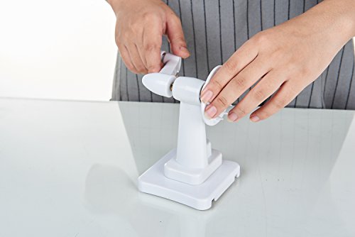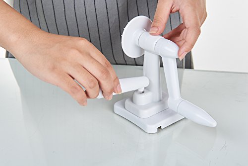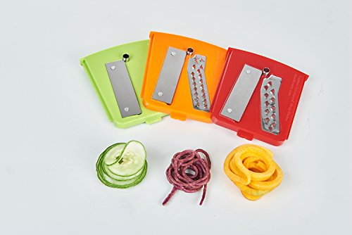 WHAT MAKES IT DIFFERENT? The 3 blades are clearly labeled & designed to make a wide variety of cuts (wide ribbon noodles) | Large, foolproof suction pad with easy ON/OFF lever for steadfast operation | Extra blade caddy for safe storage of blades - no more loose blades that can go missing or cause accidental injuries | Quick release mechanism of the blade rack for the most compact storage/transport | Designed to be dead easy to use, clean & store, even for arthritis hands.