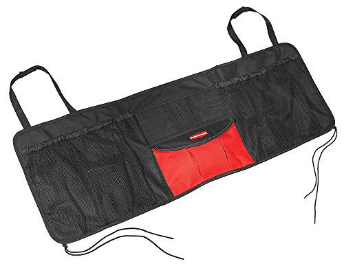 -. Feature : Designed to Securely Hang from the Backseat of the Headrest Posts / Includes 2-Large Side Pockets that Keep Toys, Pet Gear, and Tools Organized, and Easy to Find / Unique Woven Elastic Grid Holds Small Loose Items Keeping Them Handy and From Getting Lost / Spacious Center Pocket Includes a Velcro Flap Intended to Conceal Valuables / Position on the Backseat or Bench of the car to Allow for Easy Access