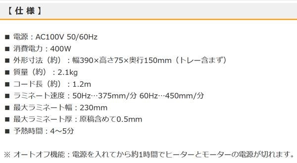 100・150ミクロンフィルムに対応しています。電源を入れてから約1時間後にヒーターとモーターの電源が切れる、オートオフ機能付きで消し忘れの心配もありません。一体型リアトレーで収納も便利です。電源ケーブルは底面に収納可能。フィルムが詰まった時に便利な巻き込み逆転ボタンもあります。 |