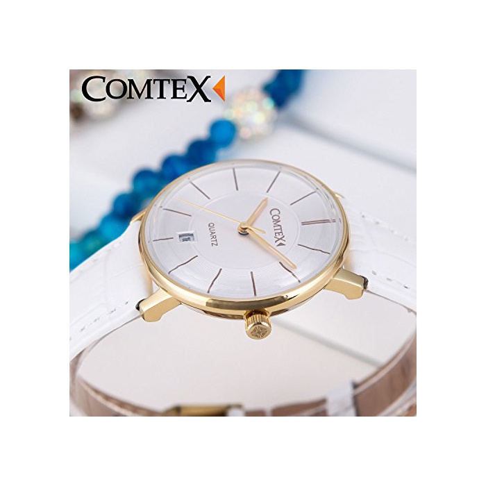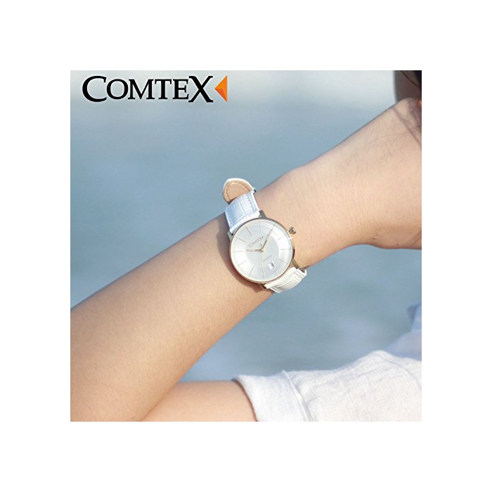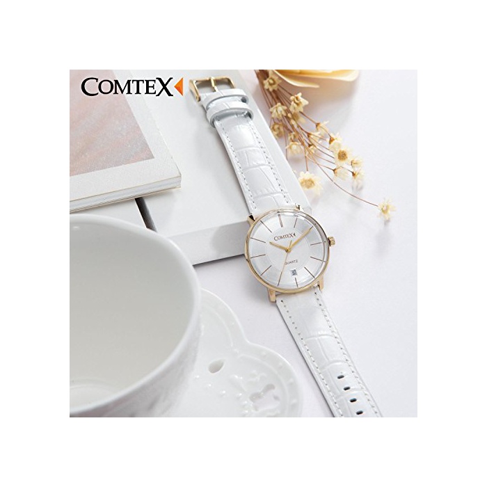 Comtex 손목시계 화이트 레더 벨트 구면 유리 아날로그 손목시계 여성 시계 레이디스