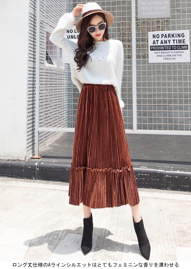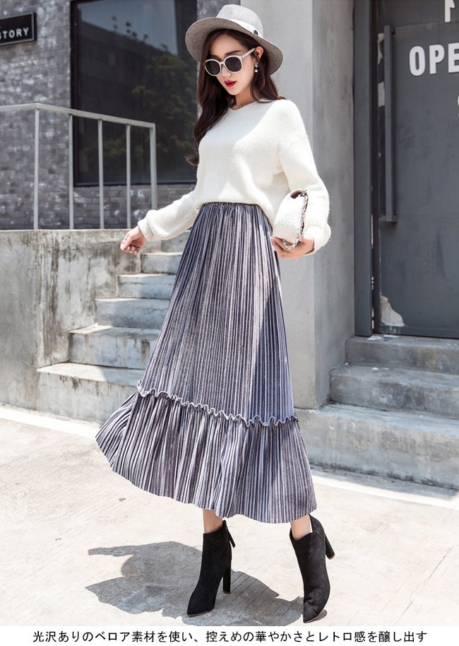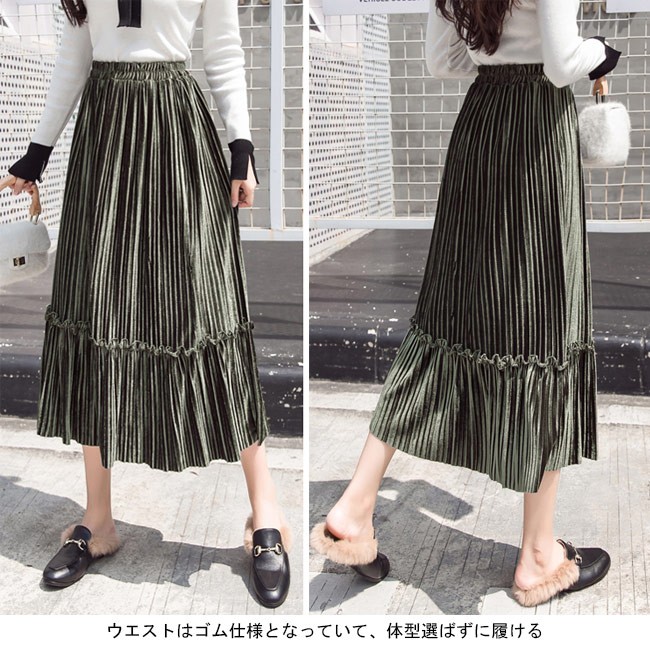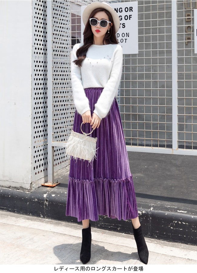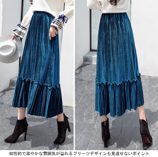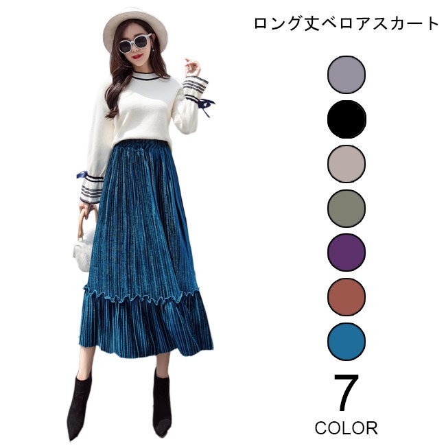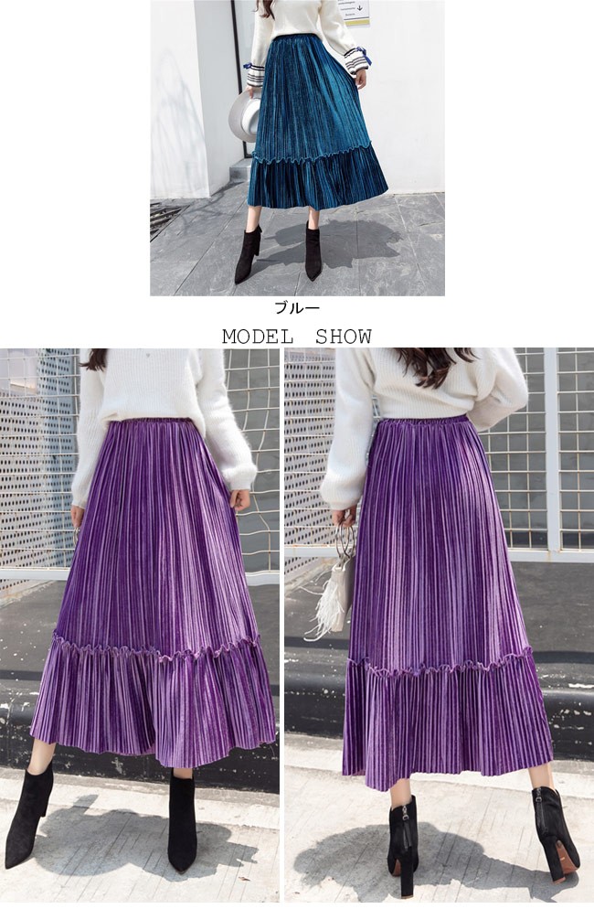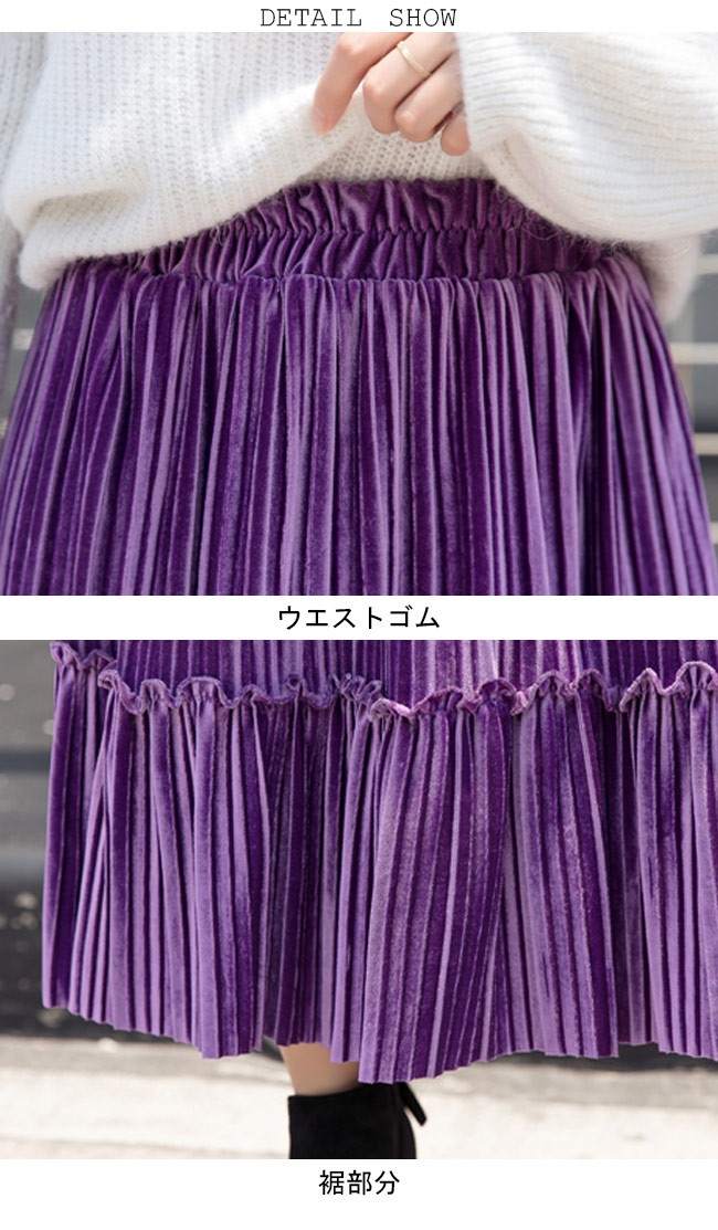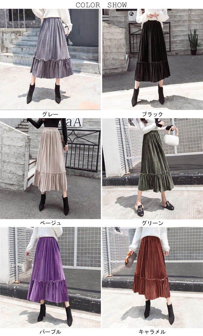 ロングスカート ベロア レディース マキシ丈スカート ウエストゴム プリーツスカート Aライン 女性用 ボトムス スカート カラバリレディース用のロングスカートが登場ロング丈仕様のAラインシルエットはとてもフェミニンな香りを漂わせる光沢ありのベロア素材を使い、控えめの華やかさとレトロ感を醸し出す知性的で淑やかな雰囲気が溢れるプリーツデザインも見逃せないポイントウエストはゴム仕様となっていて、体型選ばずに履ける雰囲気異なる7色展開でコーデをより自由に楽しめるカラー:グレー ブラック ベージュ グリーン パープル キャラメル ブルー素材 ベロアサイズ(cm) S M L XL 2XLS 総丈76 ウエスト60-84 参考体重40-50kgM 総丈76 ウエスト64-88 参考体重50-57kgL 総丈77 ウエスト68-92 参考体重57-65kgXL 総丈78 ウエスト72-96 参考体重65-72kg2XL 総丈78 ウエスト76-100 参考体重72-80kgご注意:※サイズは平置きサイズです。素人採寸ですので、若干の誤差がございます、ご了承ください。