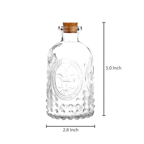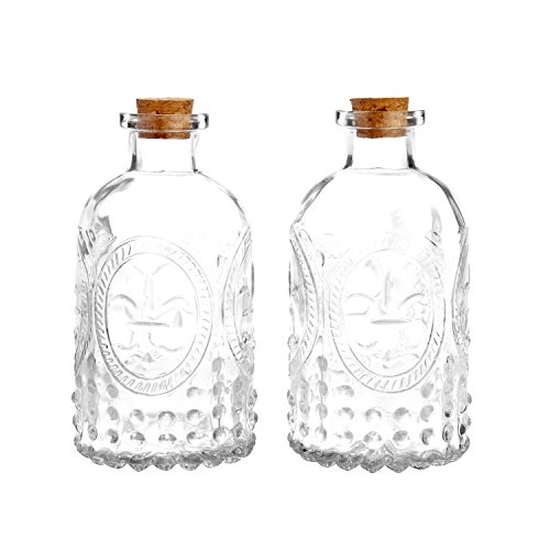 Vintage Design Embossed Clear Glass Bottles, Apothecary Flower Bud Vase with Cork Lid, Set of 2