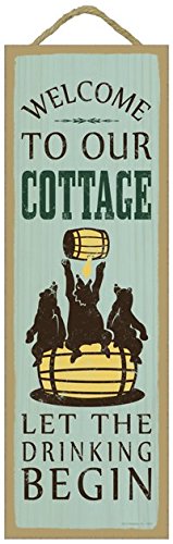 (SJT02627) Welcome to our cottage. Let the drinking begin. (bears drinking beer image) Primitive Wood Plaque - 5 x 15 inch size