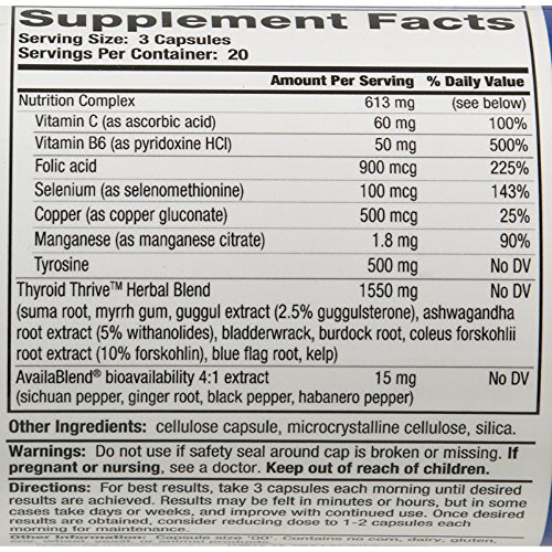 Product DescriptionThyroid Thrive is an all natural vitamin and herbal formula designed to support the thyroid and related organs.0