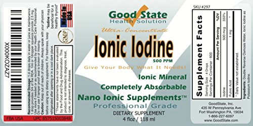 -. Binding : Health and Beauty -. Brand : Good State -. EAN : 0857515003848 -. Feature : Absorbs Much better than Pills! / Professional Grade - Natural Iodine / Easy to mix with Juice or Water / Comes with Glass Eye Dropper for Easy Dosing -. IsAdultProduct : 0 -. Label : Good State -. Manufacturer : Good State -. Model : 297 -. MPN : 297 -. NumberOfItems : 1 -. PackageQuantity : 1 -. PartNumber : 297 -. ProductGroup : Health and Beauty -. ProductTypeName : HEALTH_PERSONAL_CARE -. PublicationDate : 2014-10-02 -. Publisher : Good State -. Studio : Good State -. Title : Good State - Liquid ionic iodine - 4 drops equals 500 mcg per serving - 600 total servings - 4 ounces -. UPC : 857515003848