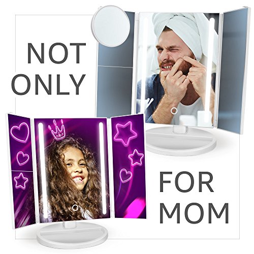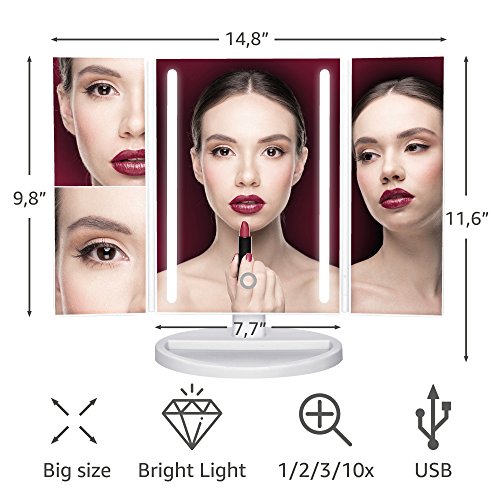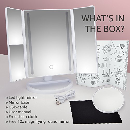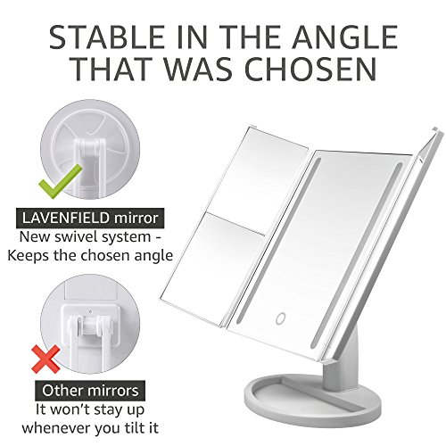 -. Binding : Misc. -. Brand : LAVENFIELD -. EAN : 0655222343352 -. Feature : MAKEUP MIRROR - Its light is just what you need to apply makeup, and it is not blinding. Our vanity mirror with lights is a big side-view makeup assistant. The mirror surface is high-quality and the plastic is pleasant to touch. / LIGHTED MAKEUP MIRROR - Keeps the chosen angle of inclination and doesn't annoy you that it leans down during makeup. LED mirror can turn up to 180° and give you an additional comfort. / LIGHT UP MIRROR - Use ECO-friendly USB or batteries when there is no USB access. The lights on lighted mirror are controlled by the touch screen button. Touch it once and the light will turn on. You can play with the brightness by holding it! You'll see how cool it is! / VANITY MAKEUP MIRROR - It will make an elegant addition to any interior. LED light mirror may be a professional makeup mirror too. / MAKEUP MIRROR FOR WOMEN - PERFECT GIFT IDEA! + BONUS makeup mirror accessories! What are you waiting for? Click the Add to Cart Button and Order NOW! -. IsAdultProduct : 0 -. Label : Lavenfield -. Manufacturer : Lavenfield -. MPN : DC-L1 -. PartNumber : DC-L1 -. ProductGroup : Beauty -. ProductTypeName : BEAUTY -. Publisher : Lavenfield -. Studio : Lavenfield -. Title : Makeup Mirror - Vanity Mirror With Lights - LED Lighted Makeup Mirror For Women - High-quality White Plastic – Vanity Makeup Mirror Accessories - 2/3/10x Magnification - LED Light Up Make Up Mirror -. UPC : 655222343352
