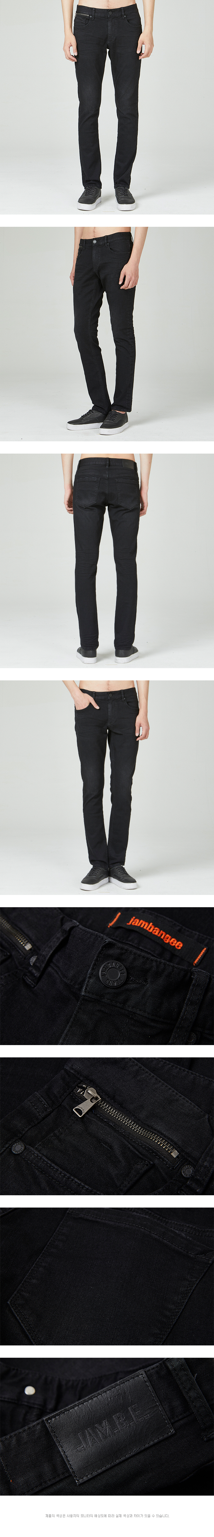 블랙 칼라에 은은한 엠보와 브러쉬 워싱과 금속지퍼로 포인트를 준 스타일리쉬한 남성용 SG핏 데님 스타일.