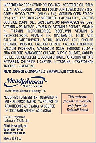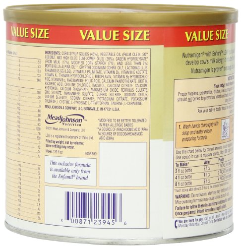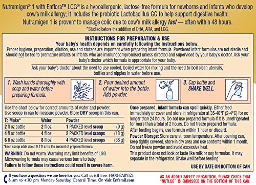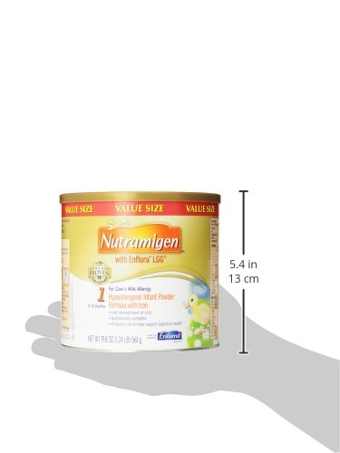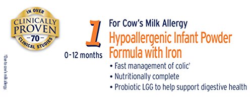 Nutramigen with Enflora LGG* is clinically proven to manage colic due to cow’s milk allergy fast, often within 48 hours†. The powdered form includes the probiotic LGG and has been proven to help build oral tolerance to cow’s milk. Nutramigen with Enflora LGG provides complete nutrition for your baby’s first year and is proven in over 70 studies. Its extensively broken-down proteins are hypoallergenic and easy to digest.Feature