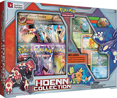 -. Feature : You will receive a box at random that contains either a foil oversize card featuring P.R.Imal Groudon-EX or P.R.Imal Kyogre-EX / Contains 3 special foil cards featuring Treecko, Torchic, and Mudkip, with all-new art / Comes with an all-new collector's pin featuring Treecko, Torchic, and Mudkip / Contains 3 Pokemon TCG booster packs / You will also get 1 bonus code card for the Pokemon Trading Card Game Online