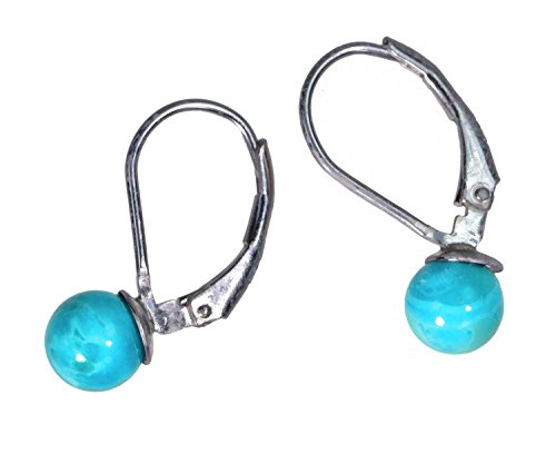 This is a pair of Turquoise round earrings, set on a sterling silver leverback. Sleeping Beauty turquoise colors, with darker teals on a light blue base; stones are unique, item shipped will vary slightly; 6mm opal, 15mm height, 15mm width. Stamped 925. This is a pair of elegant Turquoise dangle earrings, set in sterling silver; old stock stabilized Sleeping Beauty Turquoise. 6mm small size Turquoise. Samples of these stabilized Turquoise gemstones have been tested by the Gemological Institute of American and issued GIA identification certificate #6173790768. The Sleeping Beauty Mine was found in Globe, Arizona and was regarded as one of the most significant Turquoise producing mines on the earth. The Sleeping Beauty Mine heritage began over 40 years ago when it was at first mined for gold and copper. •IMPORTANT: The Sleeping Beauty mine in Arizona shut down its Turquoise-mining operations over the summer time of 2012. It has become very rare in the jewelry industry. The Turquoise from the Sleeping Beauty Mine was often preferred by the Zuni Pueblo silversmiths. The Sleeping Beauty Mine in Globe Arizona is closed, this is old stock Turquoise from there. These earrings are rhodium finished for a white-gold or platinum overall look and anti-tarnish.Feature