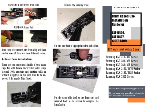 - Feature : Use your soldering tools and skills to install this drum reset fuse and save £££ $$$ €€€. It comes with an easy installation manual. / Do not have tools or worried about installation? You can try our "Peel & Stick" Reset chip available on Amazon. Just search Peel stick reset chip. Single Pack and Twin Pack / Use for : CLP 310 / 315 / 320 / 325 / 360 / 365 Series including N and W models / Use for : CLX 3170 / 3175 / 3180 / 3185 / 3300 / 3305 Series including W, FN and FW models / Why change the drum unit if that is not worn out? Use this reset fuse to save huge time and money. Do not have tools or worried about installation? Why not try our Peel and Stick reset chips? Single Pack and Twin Pack are available on amazon. Just search "Peel stick samsung reset chip".