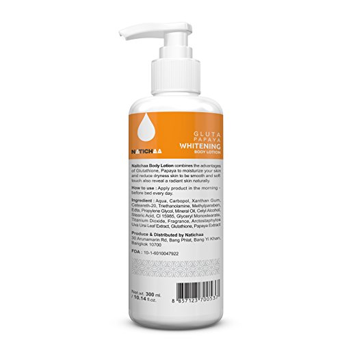 -. Feature : A BODY LOTION FOR FLAWLESS SKIN: Are you longing for a lighter skin tone that is free of blemishes, scars and imperfection of any kind? The Natichaa papaya whitening body lotion will reduce your body acne, heal your scars and diminish your red ad dark marks. Soon, any skin discoloration will disappear and your skin will have its most natural bright complexion. / A NOURISHING NATURAL FORMULA: How can you refuse the amazing benefits that glutathione and papaya can offer? Glutathione is a natural antioxidant that will regulate your skin's pigmentation and whiten it in the safest and most natural way possible. As for the concentrated papaya extract of the body lotion, it will nourish your skin, as well as soothe the areas that have been damaged by the sun. / NO MORE DRY AND DULL SKIN: Is your skin always dry and flaky? Does the dryness make your complexion look dull? Don't worry, because Natichaa can help you transform your skin and make it healthy again! So apply the Gluta papaya whitening body lotion to the areas where your skin is dry and watch how your skin will immediately glow and become healthier and brighter. / FOR SKIN AS SOFT AS VELVET: Moisturized skin does not only look amazing, but it also feels amazing! The Natichaa skin whitening body lotion will moisturize your skin and make it softer than ever! The concentrated glutathione will remove all of the toxins and the papaya extract will nutrify your skin, so that it become as soft as velvet! Try it out and see for yourself! / DON'T FORGET TO APPLY DAILY: There's only one way to have soft, hydrated and radiant skin -with proper moisturization. Massaging your self with the lightweight skin whitening body lotion is a very pleasant, refreshing and relaxing procedure, so you have no excuse to not moisturize your body daily! So don't hold back! Place an order and start moisturizing today!