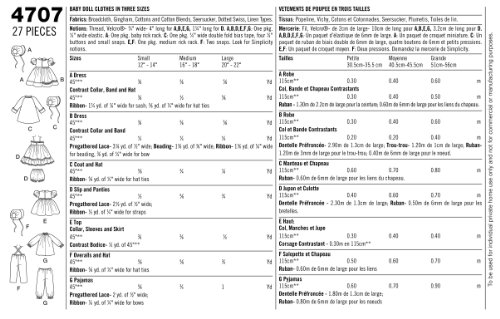 -. Feature : Doll clothes in size a (s-m-l) simplicity pattern 4707 / Number of looks included:7 / Designed and manufactured in the usa / Sested Fabrics: Broadcloth, Gingham, Cottons and Cotton Blends, Seersucker, Dotted Swiss, Linen Types