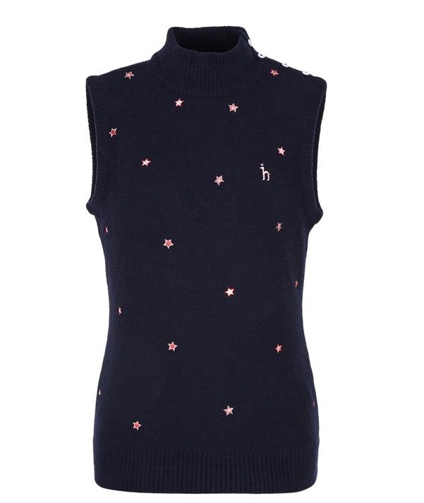 네크라인 사이드로 버튼 장식이 어우러진 하이넥 디자인의 컬러감이