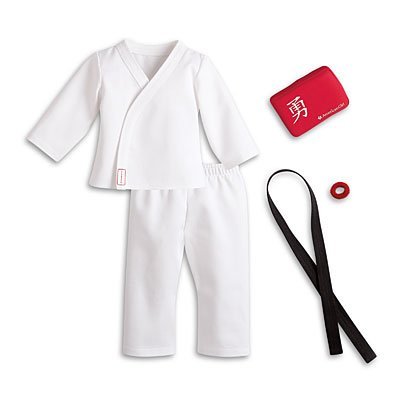 - Your girl's doll will be ready to practice her strength, balance, and quick thinking in this karate uniform! The set includes: A wrap top with karate graphic Matching pants that allow freedom of movement A black belt to show her skills and hard work A red kick pad to help her stay safe in practice A red hairband A square "Real" charm