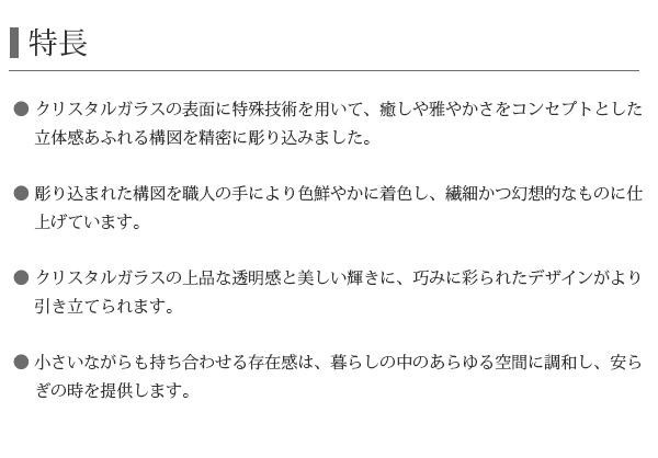 凛と澄み渡ったクリスタルに、心和むデザインを彫り込みました。癒しのデザインと美しい輝きが、あらゆる空間に調和します。