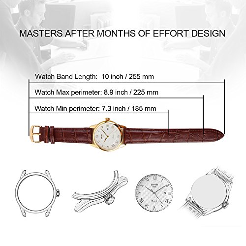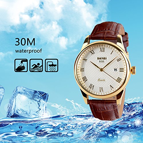 Brand, Seller, or Collection Name:JOYSAE Part Number:9058G Item Shape:Round Dial window material type:Hardlex Display Type:Analog Clasp:Buckle Case diameter:1.50 inches Case Thickness:0.30 inches Band Material:Leather Band length:Men's Standard Band width:0.80 inches Band Color:Brown Dial color:Gold Bezel material:Resin Bezel function:24 hour time display Calendar:Date Special features:Shock resistant Movement:Analog quartz Water resistant depth:30 Meters
