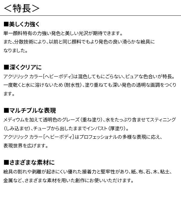 | 油絵具のような高めの粘度で、付着性にすぐれ扱いやすいのが特長です。絵画表現からホビー、クラフト、イラストレーションとジャンルを選ばず、あらゆる作品の制作に最適です。 |