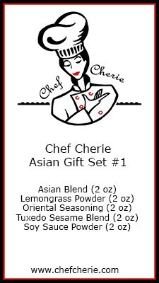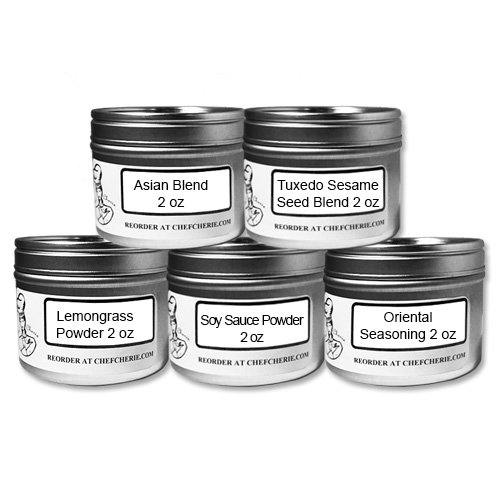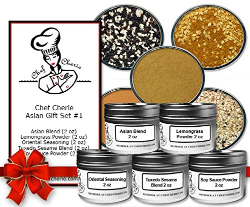 -. Binding : Misc. -. Brand : Chef Cherie -. Feature : All natural. Never any MSG or fillers. Our spices are 100% pure. / Set contains: Asian Blend, Lemongrass Powder, Soy Sauce Powder, Oriental Seasoning and Tuxedo Sesame Seed Blend (Blk & Wht) / Our manufacturer custom packs all orders by hand so you know your spice is fresh. / Excellent Gift for those who love to cook/eat Asian Cuisine / Comes in convenient 2 oz. tins for easy use and storage. -. IsAdultProduct : 0 -. Label : Spicehouse USA -. LegalDisclaimer : This is a four ounce tin that holds approx. 2 ounces of product. -. Manufacturer : Spicehouse USA -. PackageQuantity : 1 -. ProductGroup : Grocery -. ProductTypeName : GROCERY -. Publisher : Spicehouse USA -. Studio : Spicehouse USA -. Title : Chef Cherie's Asian Spice Gift Set #1 - Contains 5 - 2 oz. Tins