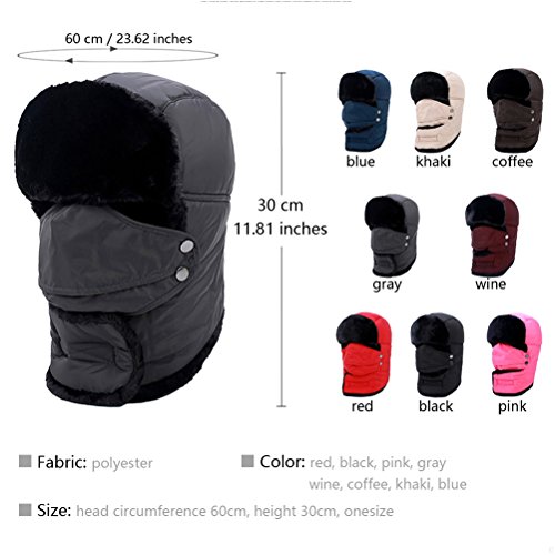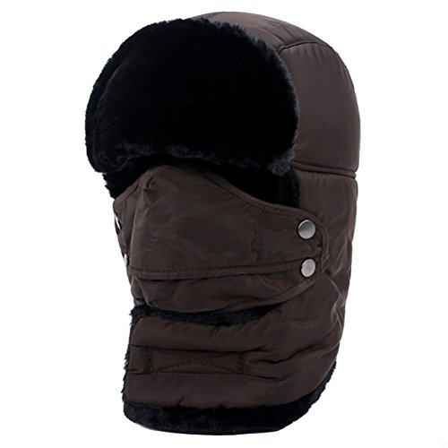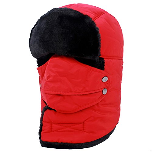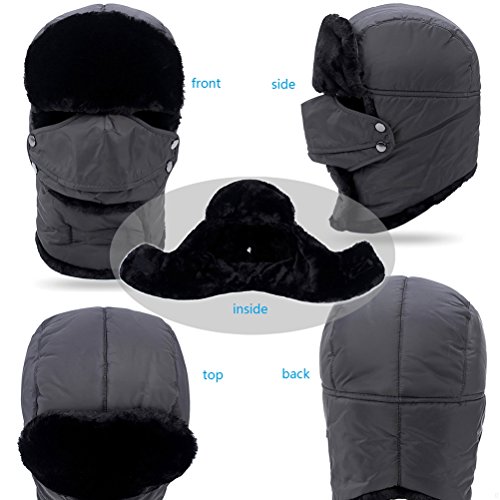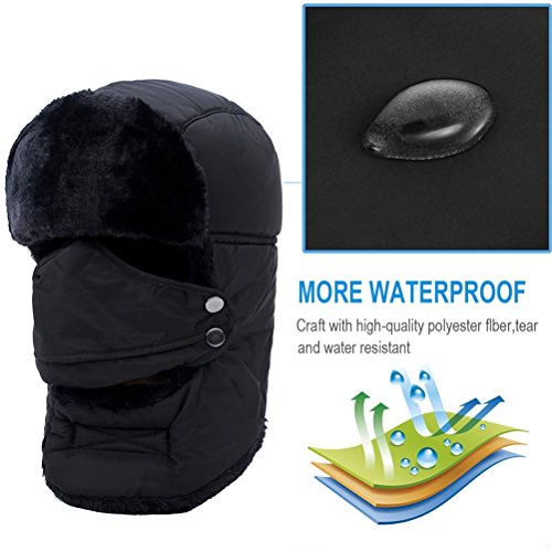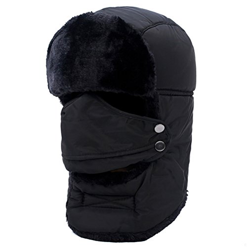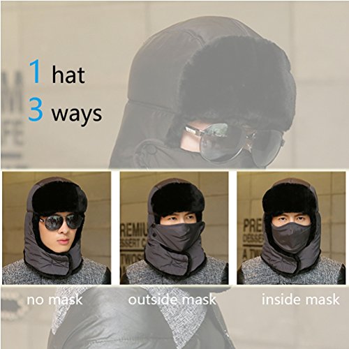 Feature 1. REMOVABLE MOUTH-OPEN MASK: special mouth-open design, normal strap cotton mask shape with 2 buttons each side, convenient and breathable 2. NECK PROTECT: earflap of cold hat has magic tape, neck can be easily protected by the longer earflaps 3. 3 WAYS IN 1 HAT: winter trapper hat has 3 ways to wear, no mask / inside mask / outside mask 4. SUITABLE: very durable for hunters, trappers or any other outdoors activities, like skiing and snowboarding