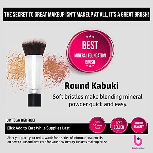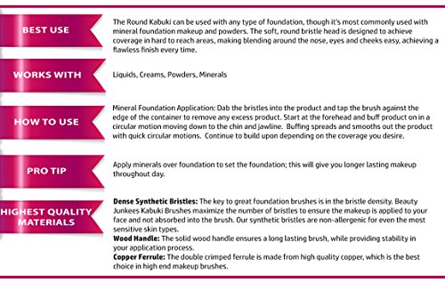 -. Feature : SAVE 50% OR MORE - Stop paying for the name! Before you spend more money on another expensive foundation makeup brush, try Beauty Junkees professional quality makeup brushes and sponges. Our brushes are ½ the price of the makeup brushes we've been compared to. You know - the big, $$$ brands! / BRISTLE PERFECTION - The key to great makeup brushes are the bristles. Our high quality synthetic bristles are soft, yet just the right density to pick up and distribute liquid foundation evenly, and doesn't splay when you push down hard on it. Applies and blends like a dream! Synthetic bristles use less product to achieve the desired look. You will find yourself asking, Where have you been all my life?!" / UNIQUE VERSATILITY- Mineral makeup is amazing, but STOP using the free starter brush! The round kabuki is most commonly used by mineral lovers. The round bristle head grabs just enough product without making a mess all over your face and distributes exactly where you want it. Blending and buffing minerals is super easy. Achieve a smooth, consistent finish every time. Perfect for stippling, buffing, blending, contouring, and finishing. / GET A SWEET DEAL - Buy Any 1 Kabuki Brush, or get the set of 5 Brushes with a BONUS Travel Brush Holder for an AMAZING low price (value $84.85). Brush Cup Holder measures 3.5" DIA X 8.75" H. This is a limited time offer. / BUY TODAY WITH BEAUTY JUNKEES RISK FREE PROMISE - Buying a good foundation brush online can be a daunting process. Try just one or the set. Be sure to read the follow up emails about how the pros recommend using each brush. Feel free to use different products and makeup techniques and see the difference a pro quality brush can make! If you're not completely satisfied with your purchase, just return it for a no questions asked FULL REFUND!