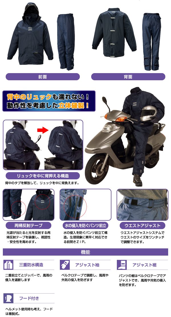 ● Mesh liner to reduce unpleasant stuffiness and stickiness ● Release the tabs on the back and carry the backpack inside ● Pants front preventing stand preventive ● Hood detachable ● waist adjustable ● with storage sack