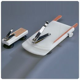Studio : Sammons Preston Publisher : Sammons Preston Binding : Health and Beauty Product Description Designed for people with weak grasp or use of only one hand. Deluxe model has durable base with pivoting nail clipper. Arched ramp accommodates different finger thicknesses. Replaceable emery boards secured by thumb screws both horizontally and vertically. Economy model has heavy-duty clipper and attached strip of filing paper. Both models secure to table top with suction cups. 0