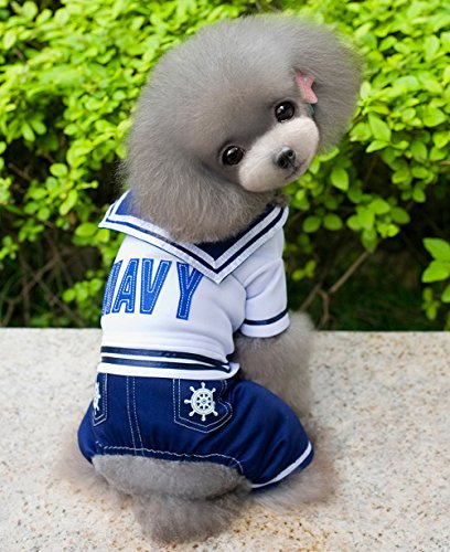 -. Feature : This puppy clothes runs small. Only fit for small pet dogs cat puppy under 20lbs. Please take a measurement of your dog before your purchasing. / Cute navy captain design, fashion england style you dog will look so handsome and cool, just like a little sailor, makes your pet to be attractive and eye-catching / Eco-friendly breathable material,softness of touch,suppleness,lasting comfort. Suitable season: Spring/Summer / Suitable for pets' cosplay party,daily wearing,parties etc, perfect gift for your pet / Easy to wash and dry, machine washable