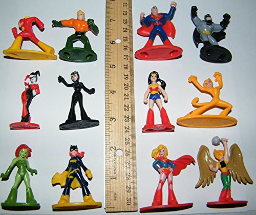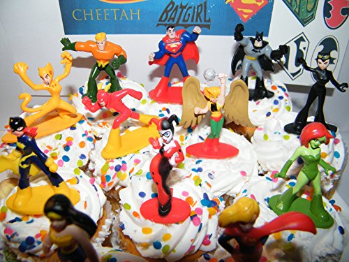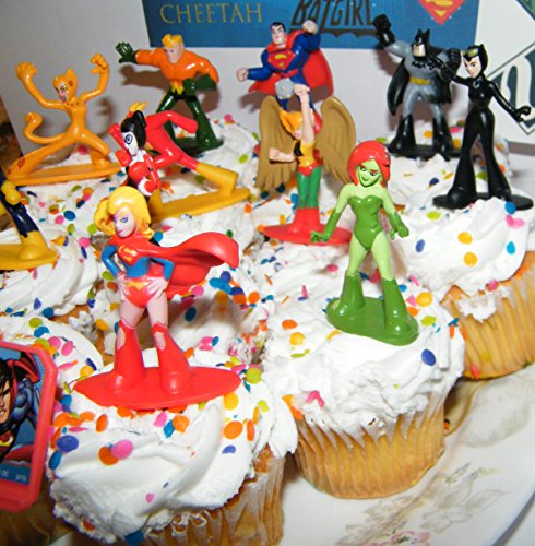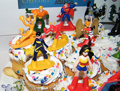 This fun cake topper set of 14 includes 12 DC Super Hero figures, a Tattoo Sheet and fun Ring!