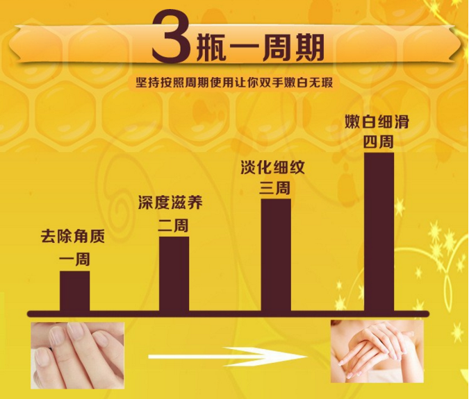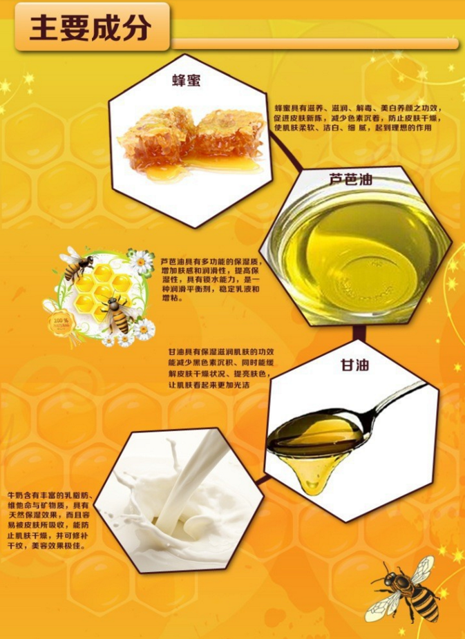 Product efficacy: Milk honey essence, replenish nutrition, soften skin, reduce skin aging surface, make the skin soft and shiny. Form a protective film on hand skin, slowing the moisture loss.