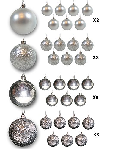 -. Feature : CHRISTMAS BALL ORNAMENTS PACKS. This is a beautiful set of 32 silver christmas balls, all different textures. In this combo pack you will get 8 matte finished ball ornaments, 8 glitter finished ball ornaments, 8 shiny finished ball ornaments and 8 sequin finished ball ornaments. The sequin finished ones have a small SNOWFLAKE design in the finish. / XMAS ORNAMENTS. Shatterproof ball ornaments are a great way to decorate your xmas tree, christmas garland or front door wreath. Use them for your DIY and craft projects with the kids. Since they are unbreakable, they are the perfect ornament to paint on. / SILVER CHRISTMAS DECORATIONS. These are the perfect addition to you silver decorations this holiday season. This is a large set of 32 ball ornaments which is a perfect gift for a newlywed couple, hostess gifts or new homeowners. / NO ASSEMBLY REQUIRED. Each ball ornaments comes with the strings already attached. They are ready to use right out of the PVC storage box they come in / SIZE. approx 2 1/2" diam 6cm