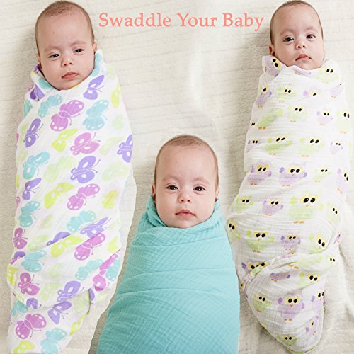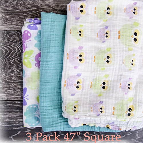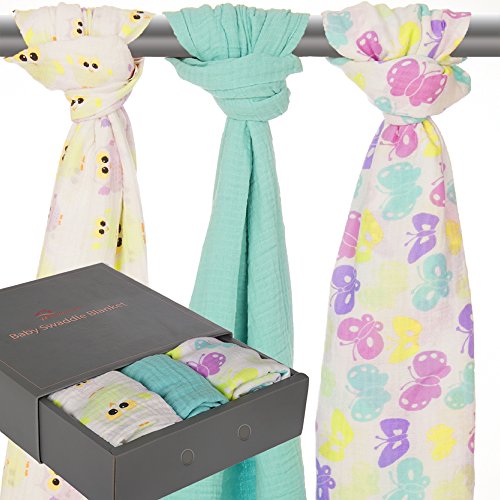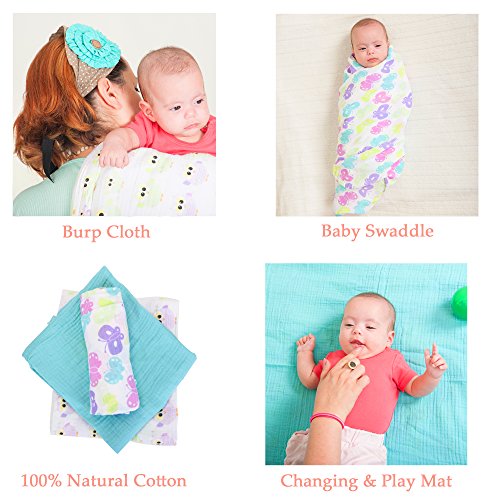 SUPER SOFT & SUPER SIZED BABY MUSLIN SWADDLE BLANKET SET: LIGHTWEIGHT, HIGH QUALITY BREATHABLE WEAVE MUSLIN, Large size 47″x 47″ each for Easy Safe Swaddle and Many Other Use.