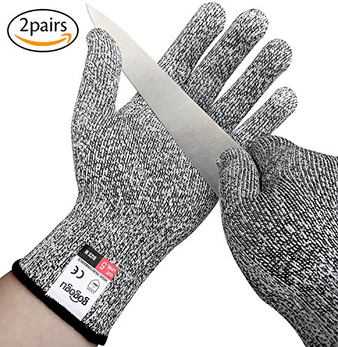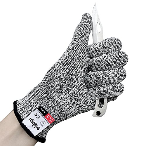 - GREAT MATERIAL - Our cut resistant gloves are made of high-tech anti-cutting fiber and glass fiber mixed knitting, in line with EN388 3 level anti-cutting standards, anti-cutting and flexibility. The wrist part of the composite material made of knitting, to EN388 5 anti-cutting standards to strengthen the protection of the wrist parts. 10 times stronger than normal gloves.