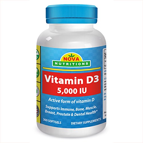 -. Binding : Health and Beauty -. Brand : Nova Nutritions -. EAN : 0732363270454 -. Feature : Active form of Vitamin D / Supports Immune, Bone and Muscle Health* / Supports breast and prostate health* - Supports heart health* / Supports congnitive health in older adults* / Promotes the intestinal absorption of calcium* -. IsAdultProduct : 0 -. Label : Nova Nutritions -. Manufacturer : Nova Nutritions -. PackageQuantity : 1 -. ProductGroup : Health and Beauty -. ProductTypeName : HEALTH_PERSONAL_CARE -. Publisher : Nova Nutritions -. Studio : Nova Nutritions -. Title : Vitamin D3 5000 IU 360 Softgels by Nova Nutritions -. UPC : 732363270454
