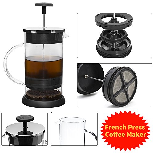 -. Feature : 1.Special coffee filter system-Our French press have independent design and development of an upgraded version of slag isolation system, it can lock the separation of slag water automatically, guarantees leaving no traces of grounds in your cup / 2. Large capacity, 1 Liter (about 8 small coffee cups or 4 coffee mugs),Borosilicate glass for strong & heat resistant / 3.Simple and easy to use by classic simply brewing method for get rich flavor to your every cup / 4.Plating cover for aniti-broken,Silicone basement for non-slip / 5.Multifunction: You can use tea infusions, hot chocolate or scented tea instead of coffee, it is the best gifts for friends and family, ideal for home,party,office usage.