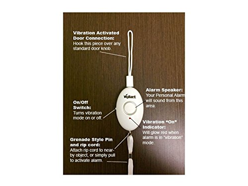 -. Feature : ✔ LOUD: 120dB personal protection door / travel alarm / ✔ VIBRATION ACTIVATED: touch sensitive activation reacts when someone disturbs the door / ✔ RIP CORD: emergency rip cord activation option (with 36" long tear away cord included) / ✔ANY DOOR: use on homes, apartments, businesses, or most doors with door knobs / ✔ VIGILANT WARRANTY: Vigilant alarms come with a full 1 YEAR WARRANTY. We're a Florida, USA based company with employees and product manufacturing in America and China. All Vigilant pepper spray is manufactured in the United States. Our alarms are designed in the United States and manufactured in China.