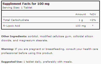 Dietary supplement. Source Naturals R-Lipoic Acid is a natural form of the lipoic acid that your body can synthesize and safely metabolize. It may be better absorbed and more effective as an antioxidant than alpha-lipoic acid. R-lipoic acid by itself may be 10 times more effective than other forms of lipoic acid and has been called the mitochondrial antioxidant because it is a key component of mitochondrial dehydrogenase complexes, which may help to slow the natural aging process in animals. Also, animal research has shown that R-lipoic acid can increase or maintain levels of other antioxidants including CoQ10, Vitamin C, Vitamin E and glutathione, which may decline with age, more efficiently than other forms of lipoic acid (These statements have not been evaluated by the Food and Drug Administration. This product is not intended to diagnose, treat, cure or prevent any disease). Suitable for vegetarians. Contains no yeast, dairy, egg, gluten, corn, soy or wheat. Contains no sugar, salt, preservatives, or artificial color, flavor or fragrance.Feature