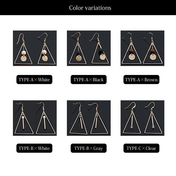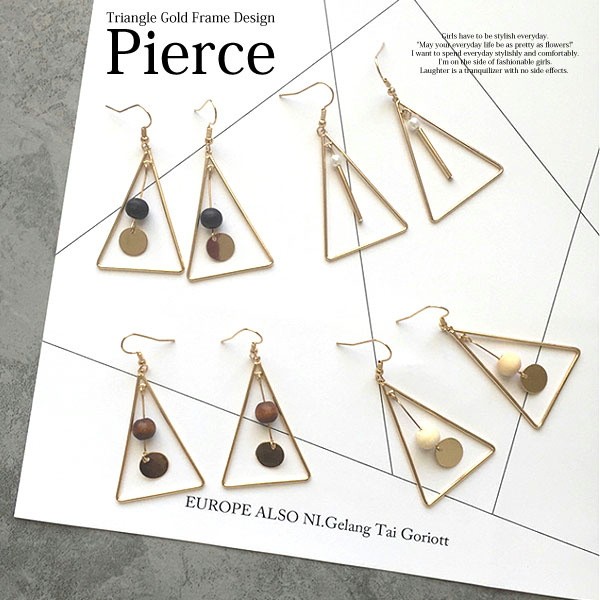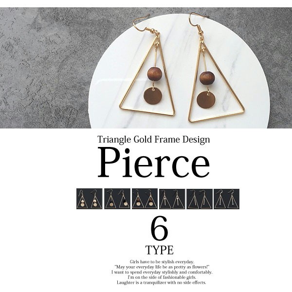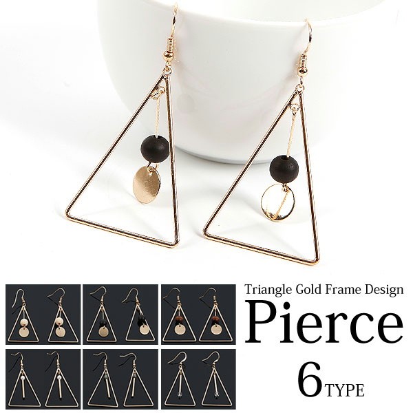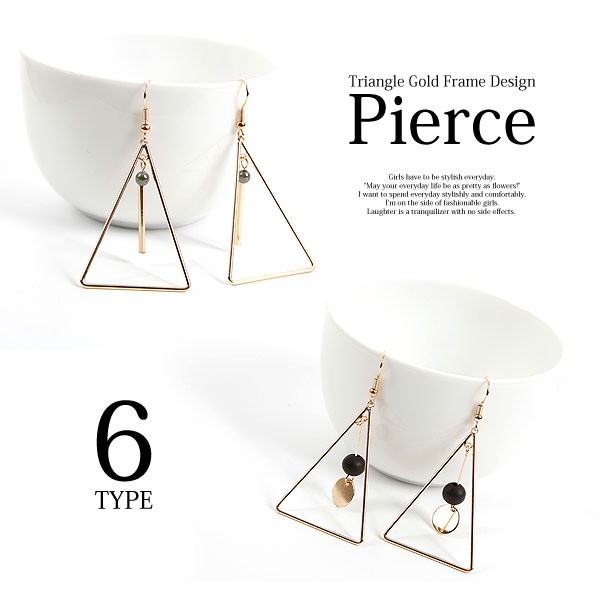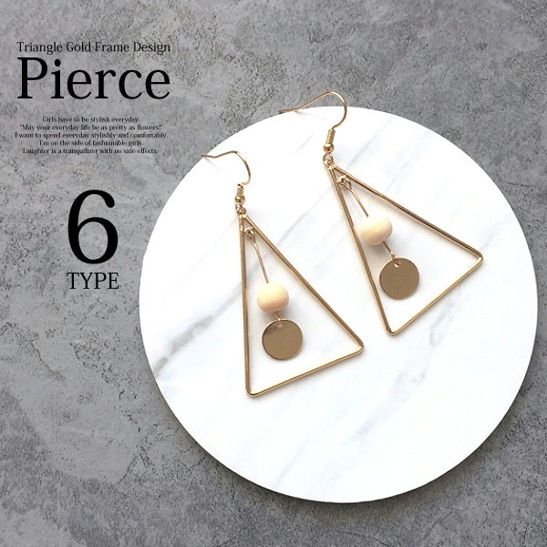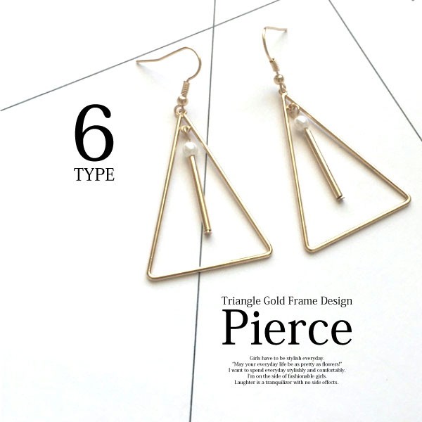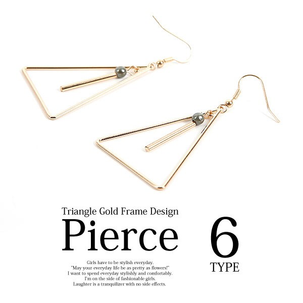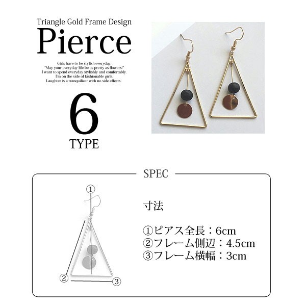 ★全6デザイン!トライアングルゴールドフレームピアス★シンプルなゴールドのトライアングルフレームの可愛いピアスチャームが選べますので、お気に入りが見つかるかも!ゆらゆらするとキラキラしてかわいいピアスです。■商品詳細■(画像8枚目参照)※注意事項※商品画像はできる限り実物の色に近づけておりますが、モニター・パソコン等の画像解像度により実際の商品と多少色味が異なる場合がございます。サイズは平置きサイズとなりますので、測り方により誤差が出る場合がございます。予めご了承くださいますようお願いいたします。