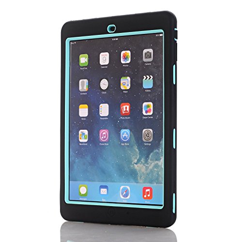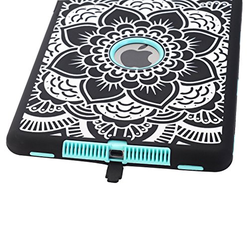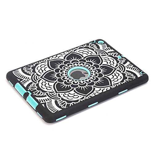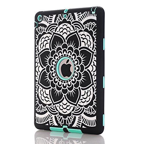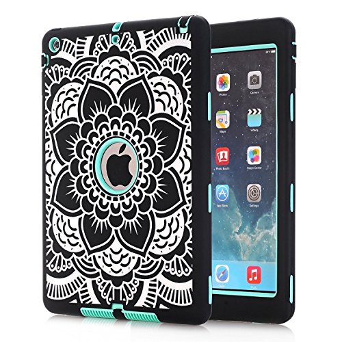 iPad Air Case, Hocase Rugged Shock Absorbent Hybrid Double Layer Hard Rubber Protective Case Cover with Stylus for Apple iPad Air (2013 Release) - Black Flower Print / Mint Green