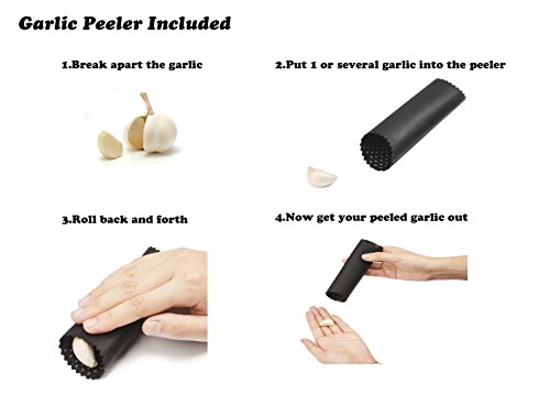 WITH SILICONE PEELER TUBE ROLLER - Comes with safe food-grade silicone tube roller that peels garlic cloves in seconds. Just place unpeeled cloves inside the tube then roll it back and forth on hard surface. It is easier to adopt the new design interior band wave point to get garlic without skin.