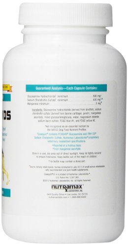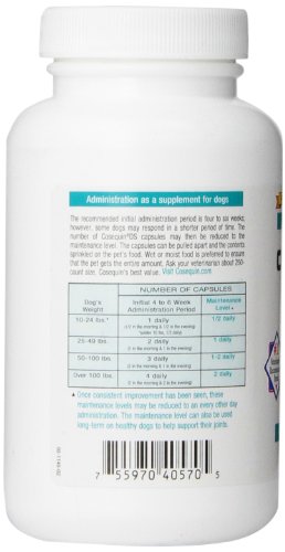 As dogs ages, it is common for their joints to become less flexible which impacts their mobility and quality of life. You may have noticed that your dog has difficulty walking up stairs or jumping on the bed. While he used to be eager to play, now he is content to rest. Even at younger ages some dogs are subject to joint health concerns which affect flexibility and mobility. Recommendation as a Supplement: The Initial Administration Period is 6 Weeks. Most animals should respond within this period. Improvement on Cosequin can range from gradual to dramatic. If the improvement is gradual, it may go unnoticed by the owner. It is therefore important to keep the animal at the initial amount for at least 6 weeks before deciding to discontinue the use of Cosequin. If there is gradual improvement and Cosequin is discontinued, a regression of clinical status can occur. Directions: Initial Administration (6 Weeks) Dogs: 25-49 lb. - 2 capsules daily (1 in A.M./ 1 in P.M.), 50-100 lb. - 3 capsules daily (2 in A.M./ 1 in P.M.), Over 100 lb. - 4 capsules daily (2 in A.M./ 2 in P.M.) Cosequin DS double strength can be used on patients under 25 lb., however, 1/2 capsule increments must be used. For convenience, Cosequin regular strength should be used. Regular strength can also be used for maintenance of dogs weighing 25-49 lb. that maintain below one capsule daily of double strength. The capsules can be pulled apart and the contents sprinkled on the pet's food. Wet or moist food works best. As an alternative, pets can be pilled or the capsules administered by wrapping in a small piece of food. Cosequin is palatable to dogs, cats and birds.Feature
