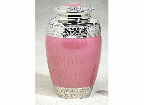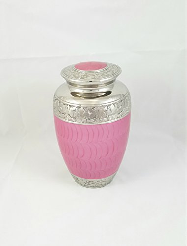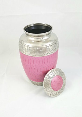Funeral Cremation Urn - Silvertone Brass with Decorative Pink Enamel Sides - Adult Size - For Ashes